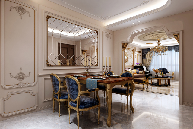 餐桌和餐椅均為金色色,表面略帶雕花,配合扶手和椅腿的弧形曲度,顯得優(yōu)雅矜貴,而在深藍(lán)色的卷草紋窗簾、水晶吊燈的搭配下,浪漫清新之感撲面而來(lái)。